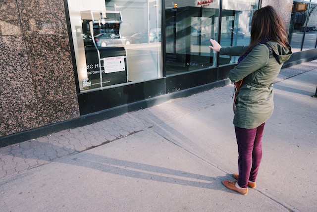 On any other November 9th, I'd probably be inside drinking something hot, but yesterday Becky came to visit and we went to Pop Up Downtown (every year, local artists fill empty spaces in Regina's downtown with art exhibits, turning the heart of the city into a little outdoor art gallery. There's a walking tour and reception, but then they leave it up for a while so people can enjoy it for a few months).